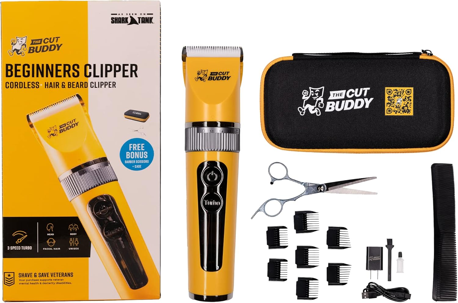 You’ll feel confident cutting your own hair with all the necessary tools in this kit, which includes a travel case, USB charger, comb, barber grade scissors, cleaning brush, 7 guard combs, lubricant, and a protective cap.