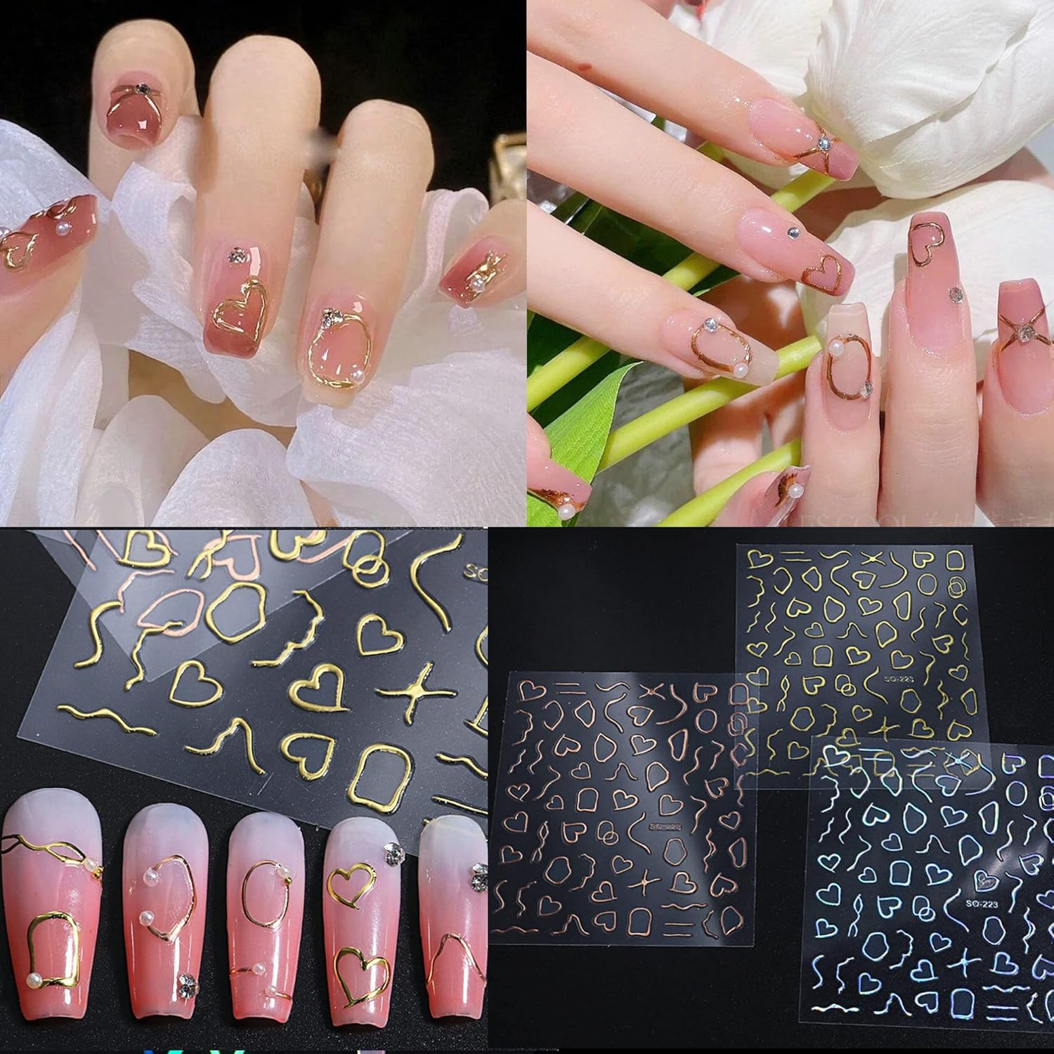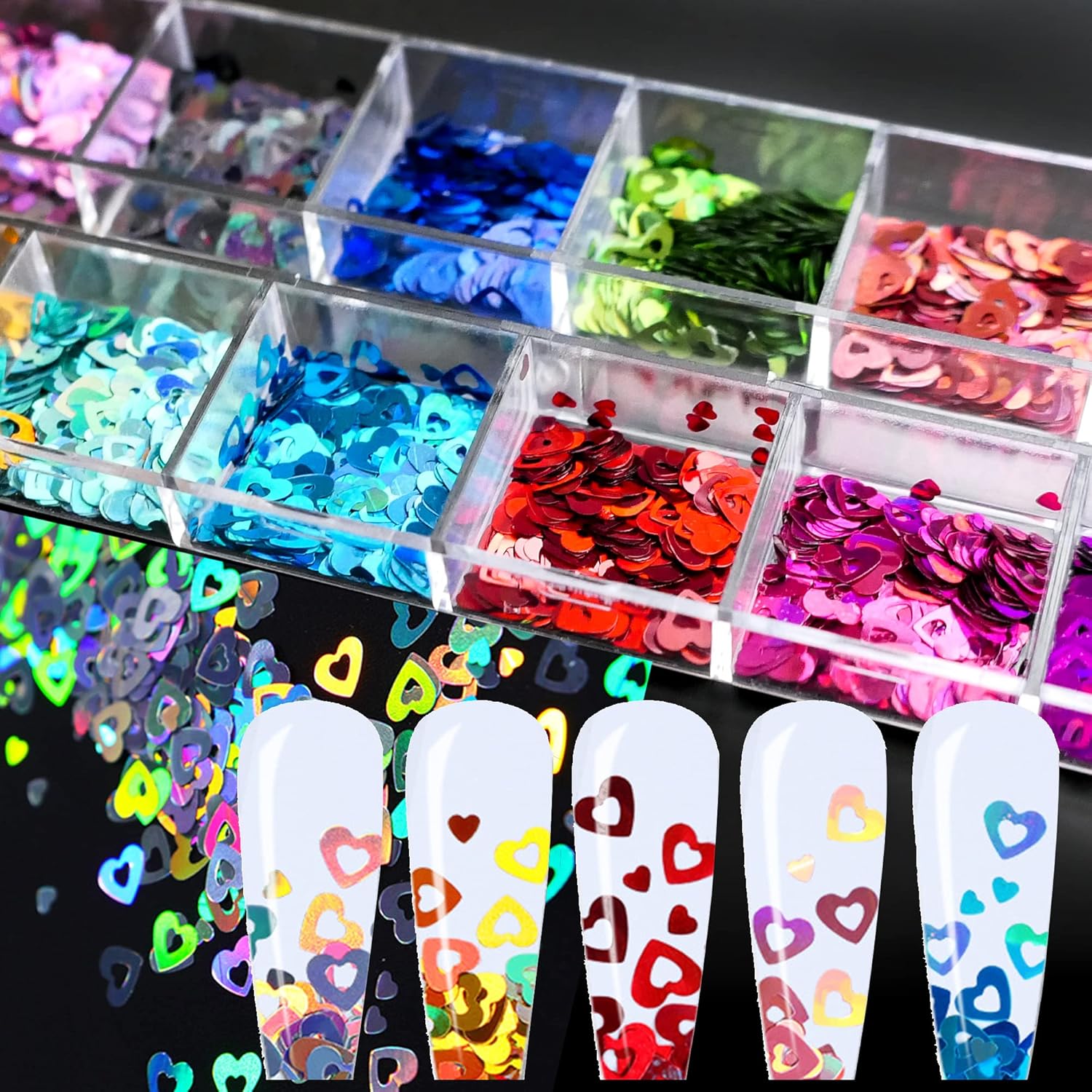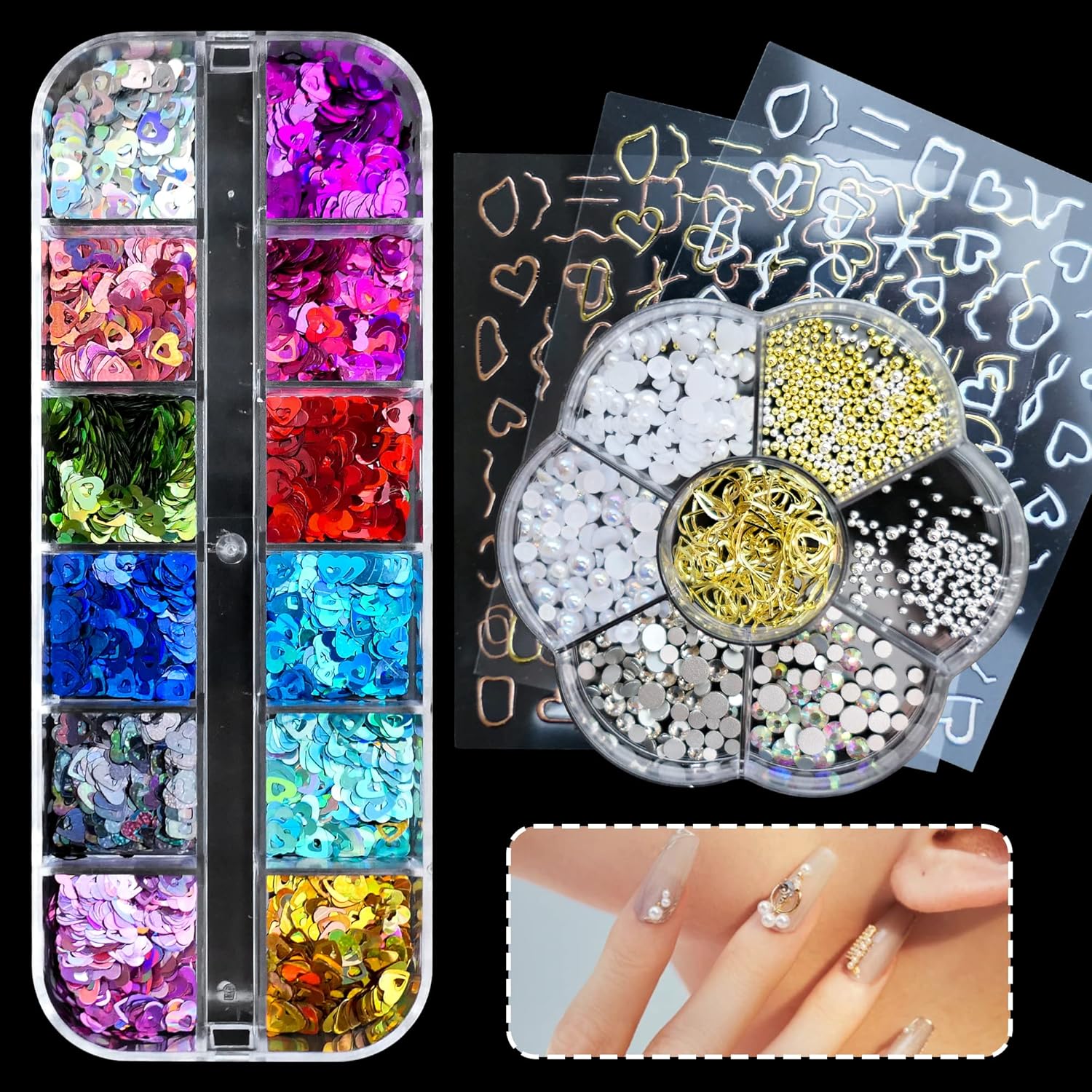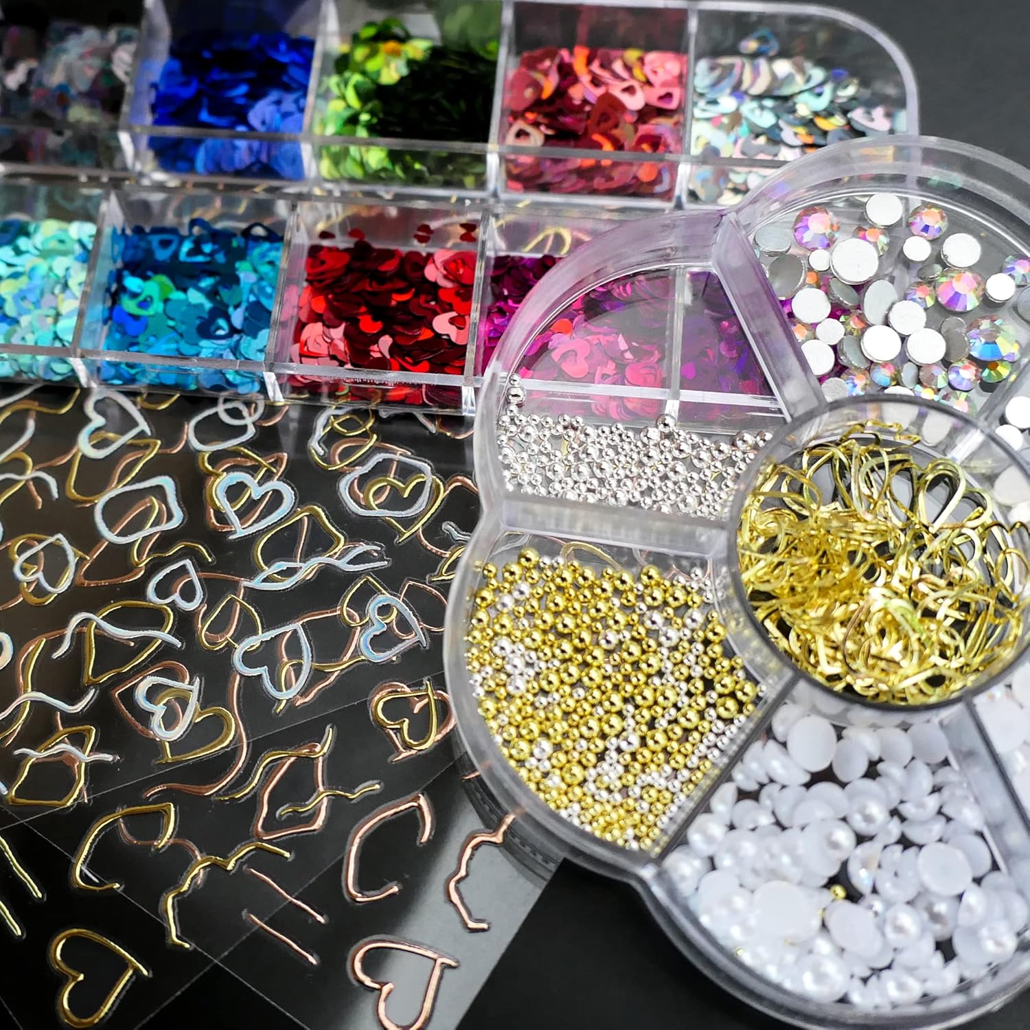 nail art decoration kit for salon and home diy nail art design Quanlity: 1 box nail gems + 1 box nail glitter + 3 sheets nail sticker Nail gems are mixed shaped and pattern, including silver caviar beads, gold caviar beads, metel gold hollow star moon square nail gems, 3 sizes white half pearls, 3 sizes ab colors half pearls, 3 sizes silver nail rhinestones, 3 sizes ab colors nail rhinestones 3 sheets heart & line holographic nail sticker- it is self adhesive design, can be derectly stick on natural nails, have 3 colors gold & silver & rose gold 1 boxes laser chunky heart nail glitter sequins: thin design, holographic 12 colors-black, silver, gold, green, red, blue, purple etc.