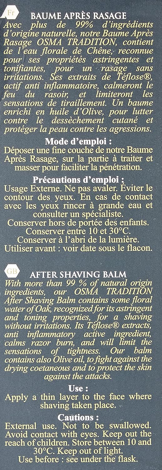 With more than 99% of ingredients of natural origin, our Osma tradition aftershave balm contains oak floral water, recognized for its astringent and toning properties, for a shave without irritation.