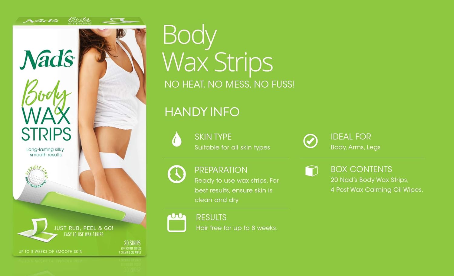 Nad’s Body Wax Strips remove hair as short as 2mm and leave your skin hair free for weeks.
