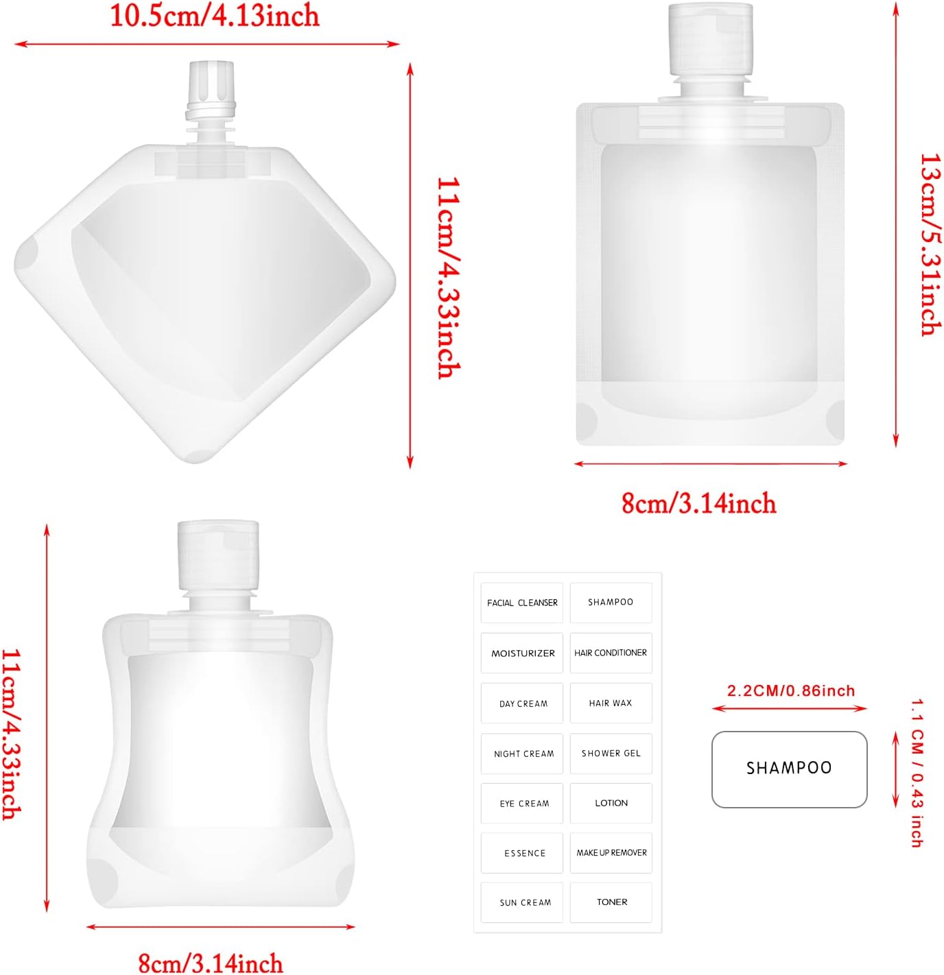 15pcs Portable Travel Fluid Pouch(5pcs Small nozzle bag+5pcsFlip bag 30ML+5pcs Flip bag 50ml,the total number is 15pcs Refillable Empty Squeeze Pouch)******* NOTE:******* Due to lighting effects, monitor”s brightness, contrast settings etc, there could be some slight differences in the color tone of the pictures and the actual item.