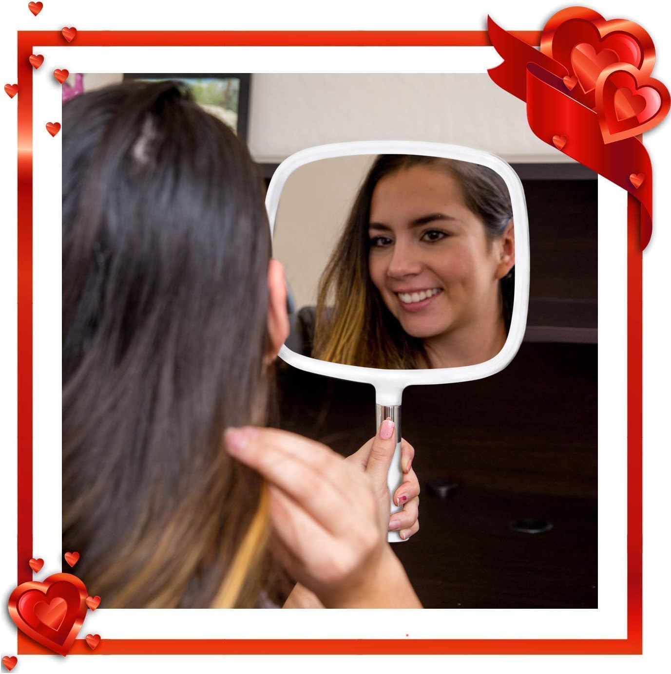 Bundle Includes: 1X Large & Comfy Hand Held Mirror with Handle (White) 1X Large & Comfy Hand Held Mirror with Handle (Premium Silver) LARGER VIEWING AREA WITH EXTREMELY COMFORTABLE HANDLE All three mirrors feature a wide-angle view, allowing you to see every detail with ease.