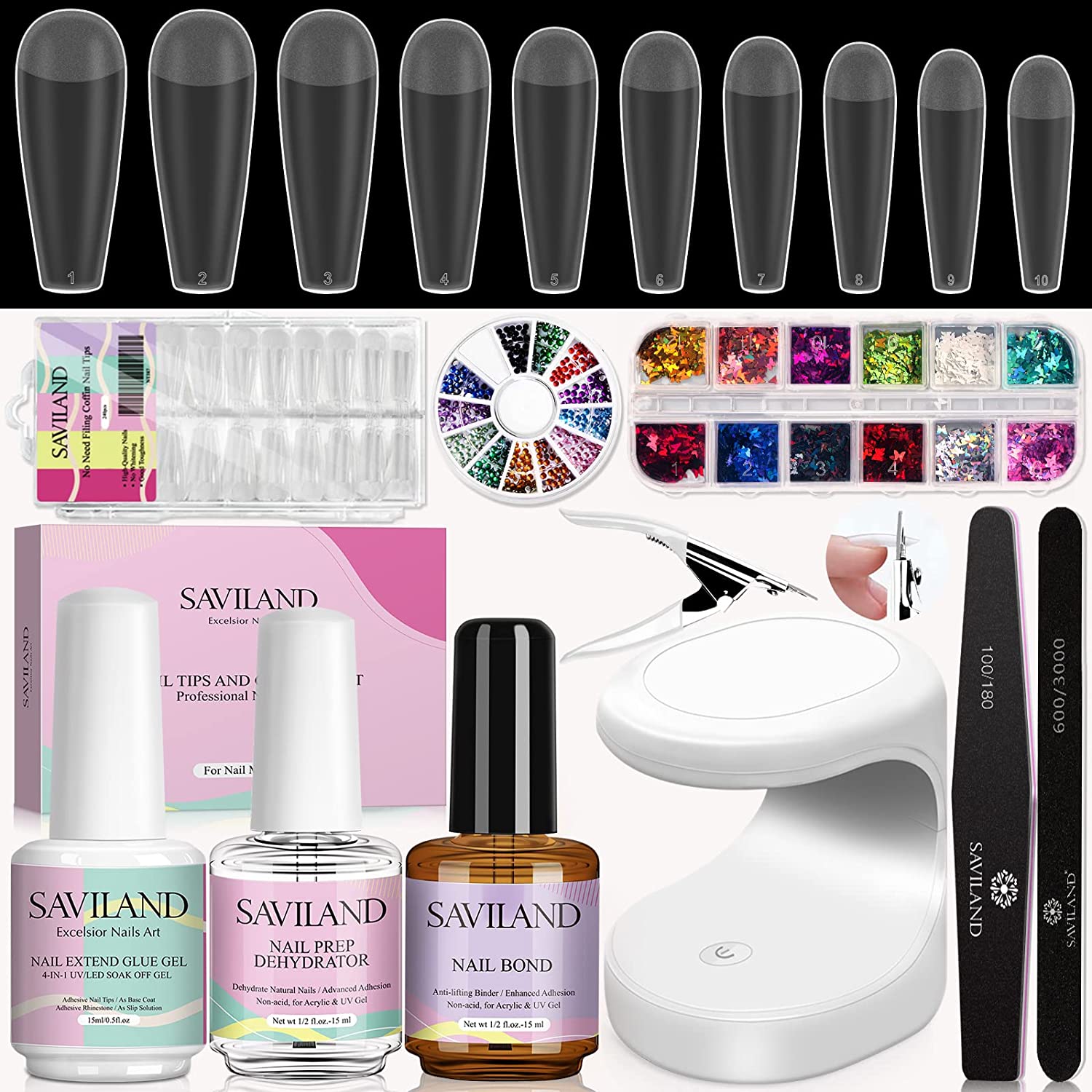 Gel X Nail Kit – Nail Prep Dehydrator & Nail Bond, 15ml Nail Glue Gel 240PCS Long Coffin Gel Nail Tips Nail Art Decoration Kit with Rhinestones Nail Supplies Design DIY At Home Gift for Mother”s Day