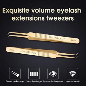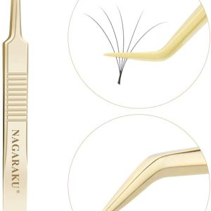 Tweezers For Eyelash Extensions Gold Curved Angled Volume Cluster Super Light Weight Easy Fanning Tweezers Stainless Steel Precision ( N-07 )