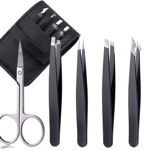 Tweezers Set Of 5, Stainless Steel Eyebrow Tweezer Scissors Set With Travel Case For Brow Facial/Ingrown Hair, Splinter (Black)
