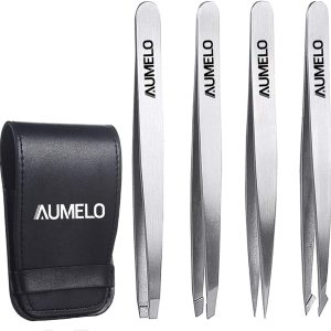 Tweezers Set 4-Piece Professional Stainless Steel Tweezers Gift With Travel Case By Aumelo – Best Precision Eyebrow And Splinter Ingrown Hair Removal Tweezer Tip,No Colored & Chemical Free