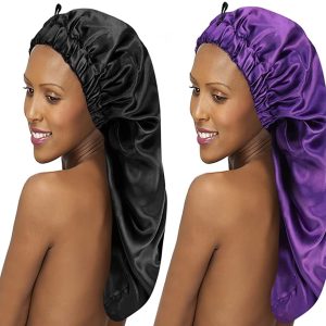 2Pcs Satin Hair Braid Bonnet For Black Women Single Layer Sleep Cap With Button Black + Purple