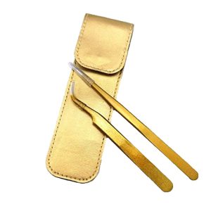 yueton 2pcs Gold Color Coated Stainless Steel Straight and Curved Head Tweezers with Leather Case for Eyelash Extension : Beauty & Personal Care