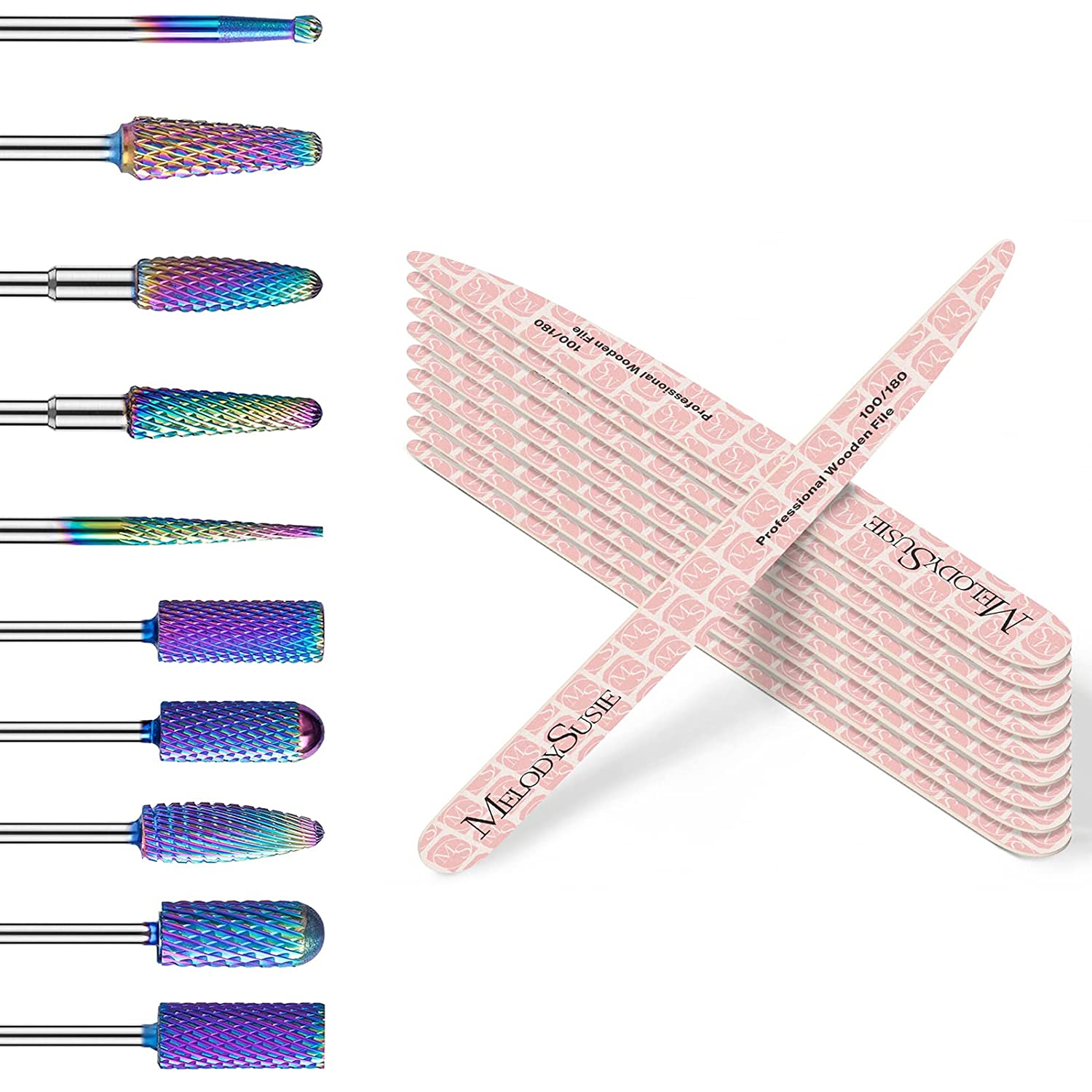 10pcs Nail Drill Bits Set with 10 PCS 100/180 Grit Professional Wooden Nail File