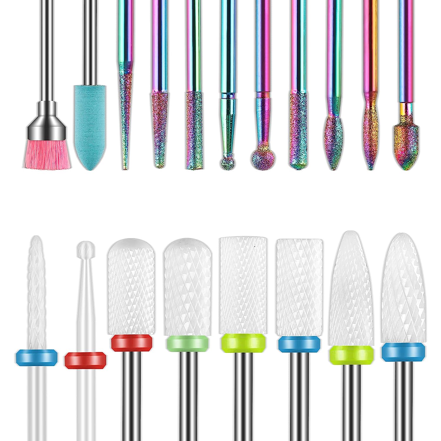 Nail Drill Bits Sets, 3/32 Inch Diamond Cuticle Electric Nail File and Ceramic Acrylic Gel Nail Bit Kit, Acrylic Nail Art Tools, Carbide Cuticle Remover Bits for Manicure Pedicure, Home Salon
