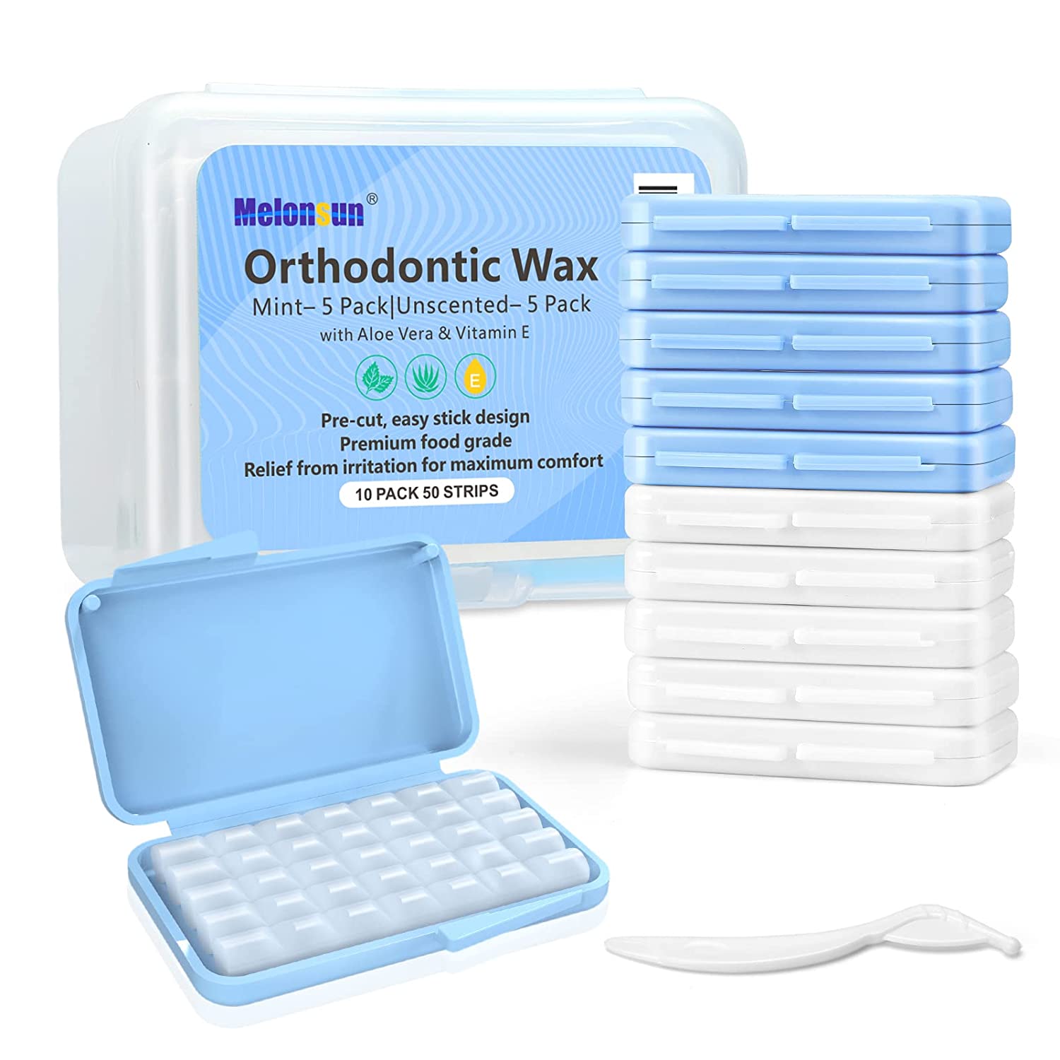 Wax, 10 Pack 50 Precut Wax Strips 350+ Dots, Includes Separate Cases, Big Storage Box & Applicator Tool, Food-Grade Premium Dental Wax- Stick Better (Unscented/Mint +Aloe Vera +Vitamin E)