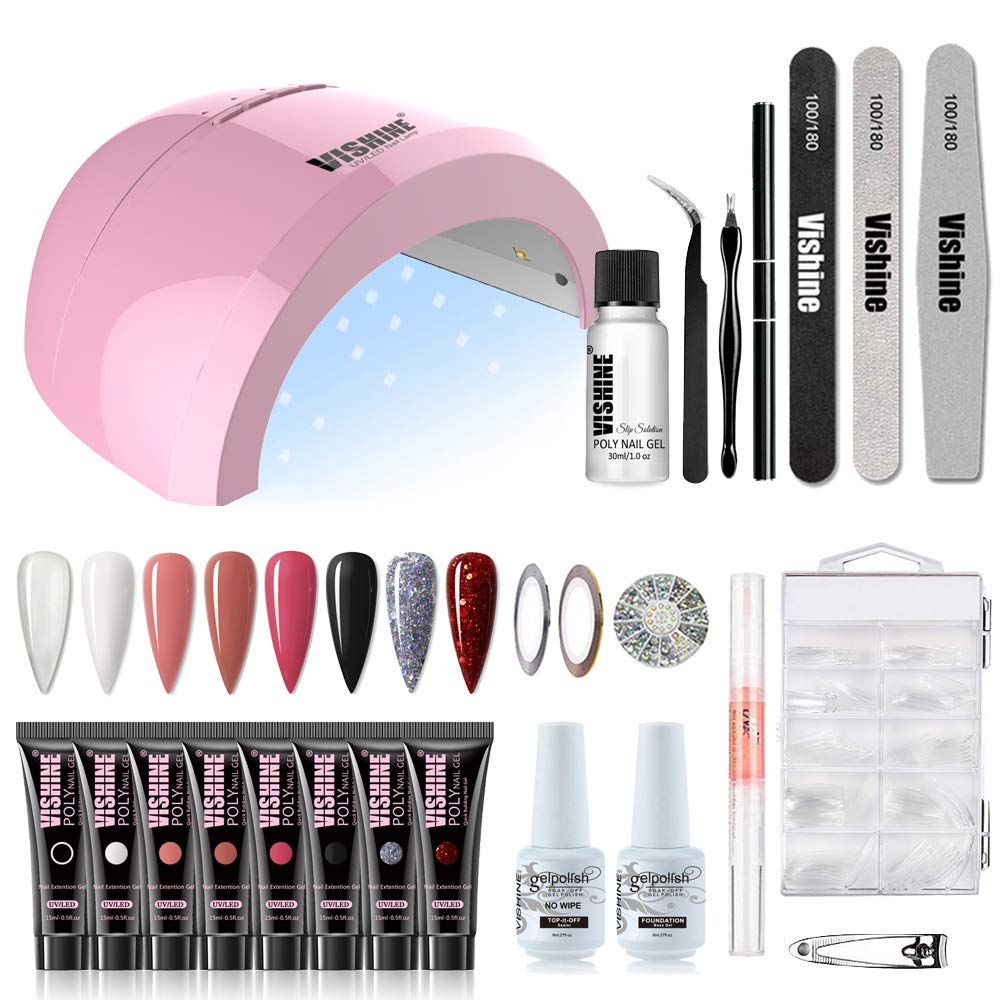Poly Gel Nail Kit – 8 Colors Nail Extension Gel Kit 48W LED UV Lamp Clear White Pink Builder Gel for Nails Slip Solution Base Top Coat Rhinestone Glitter Nail Manicure Beginner Starter Kit #04