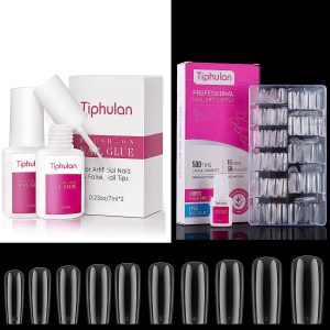 Brush on Nail Glue for Acrylic Nails with Square Nails Bundle – 5pcs Split Nail Glue Expert Adhesive Professional Glue for Press on Nails, 500pcs Clear Nails Full Cover Squoval Nail 10 Sizes