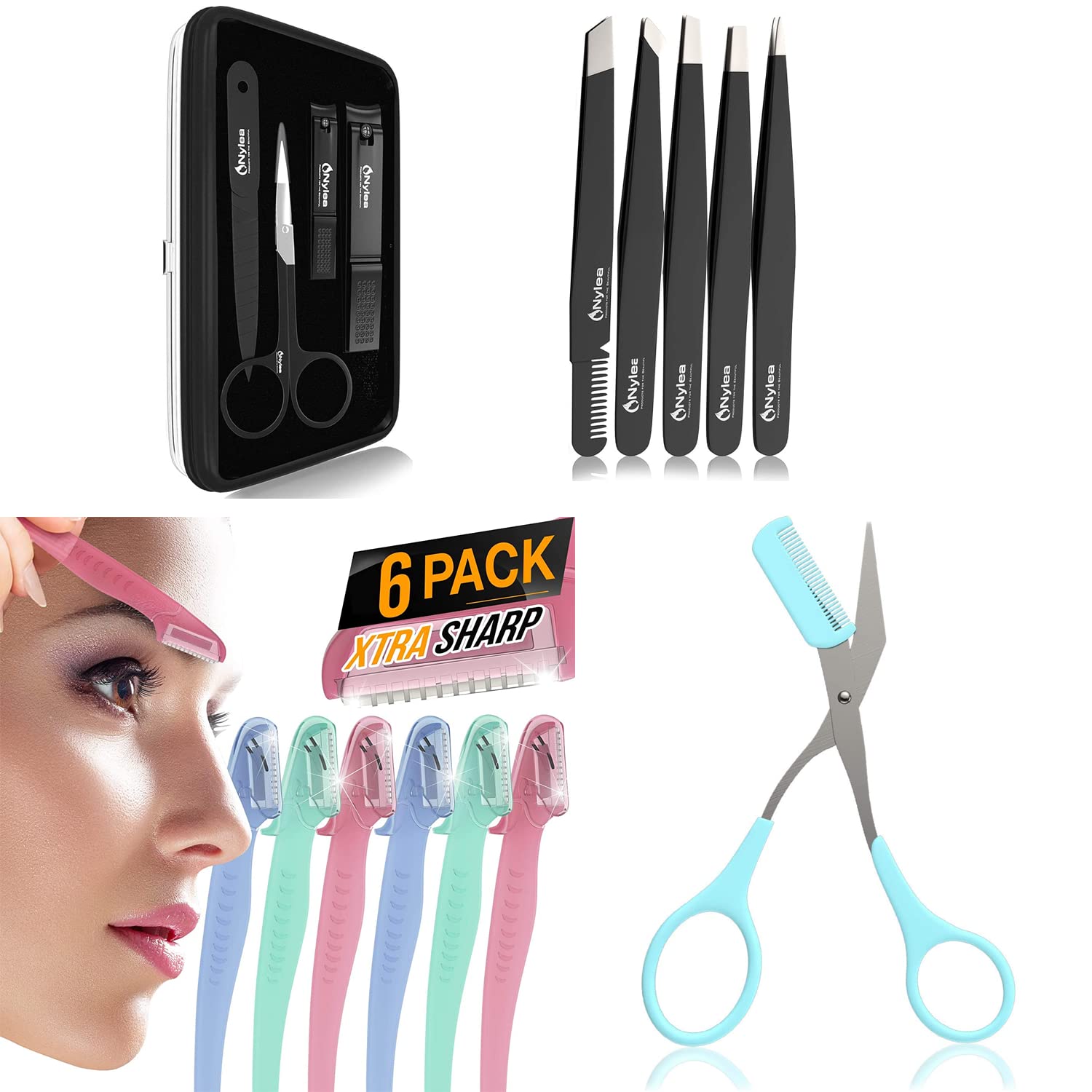 Trimmer with Razors and Professional Tweezers Set and Nail Clippers and 6 pack Eyebrow Razor