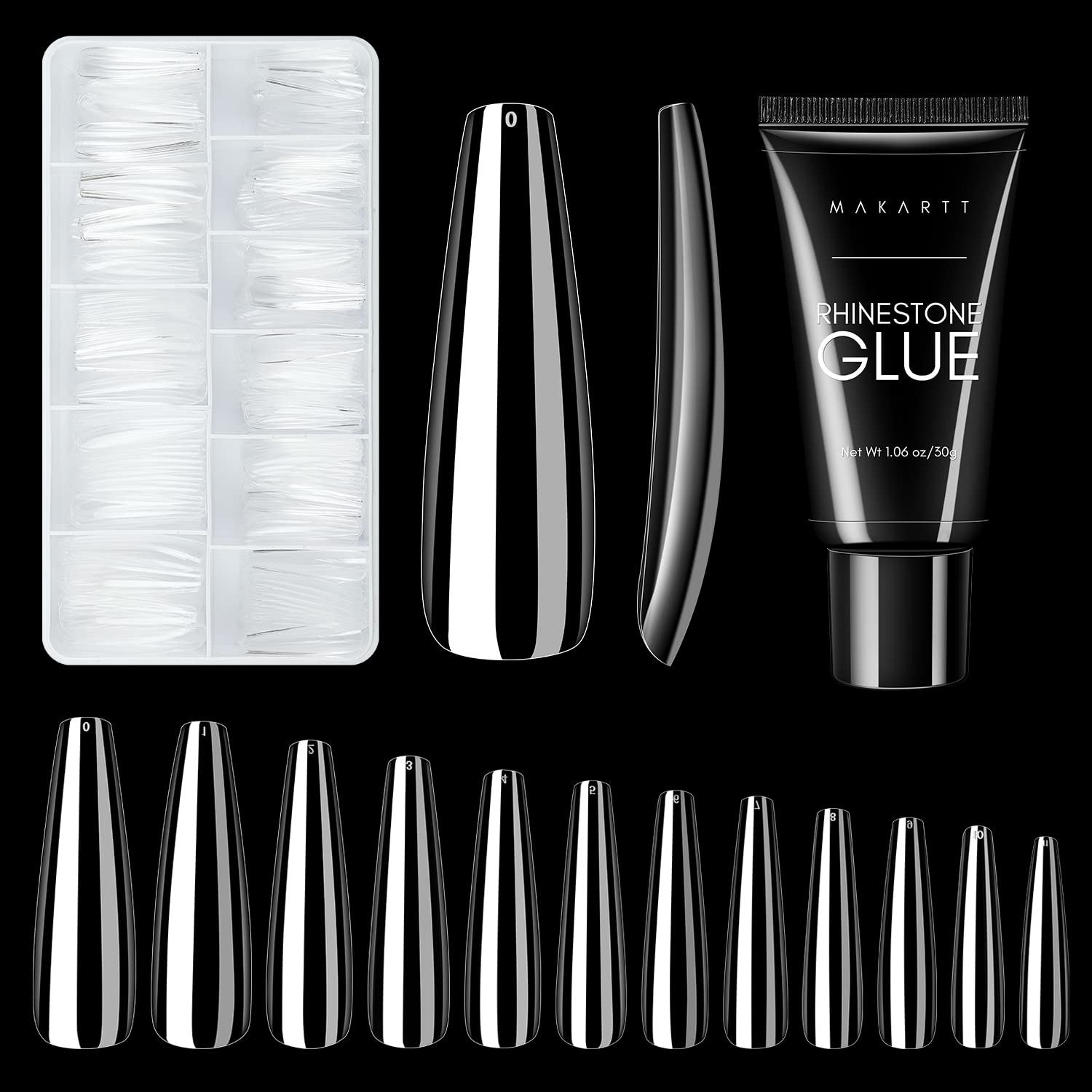 500PCS Nail Tips with Nail Rhinestone Glue Gel Bundle, Coffiin Shaped Fake Nails Ballerina, Super Strong Gem Glue Gel 1.06oz Nail Lamp Needed for Nail Glitter Jewels Crystals
