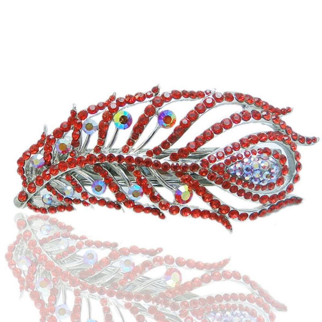 4 Inch Peacock Feather Austrian Crystal Red Hair Barrette Clip Silver-Tone