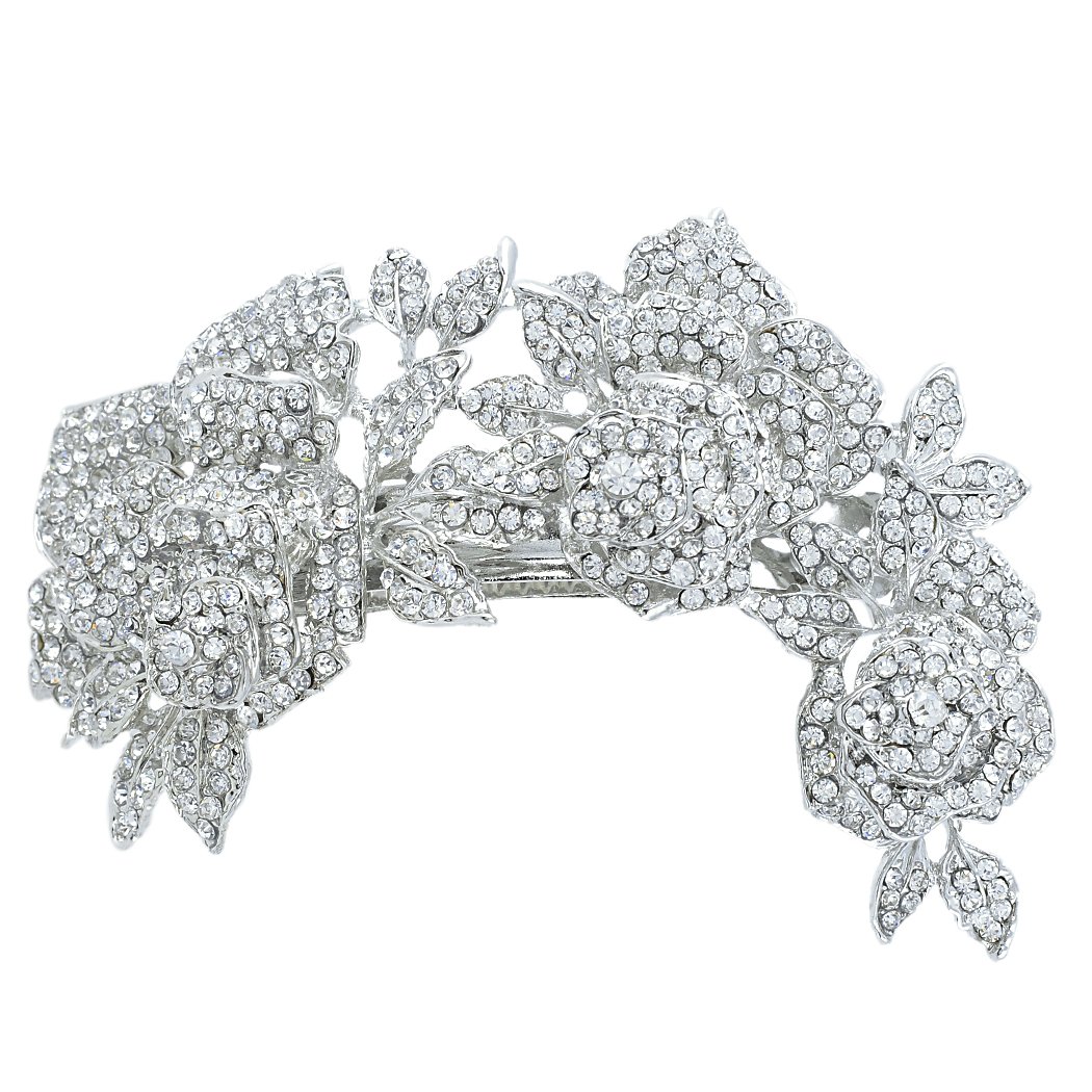 Bride Hair Barrette 3 Rose Flower Floral Clear Austrian Crystal Silver-Tone