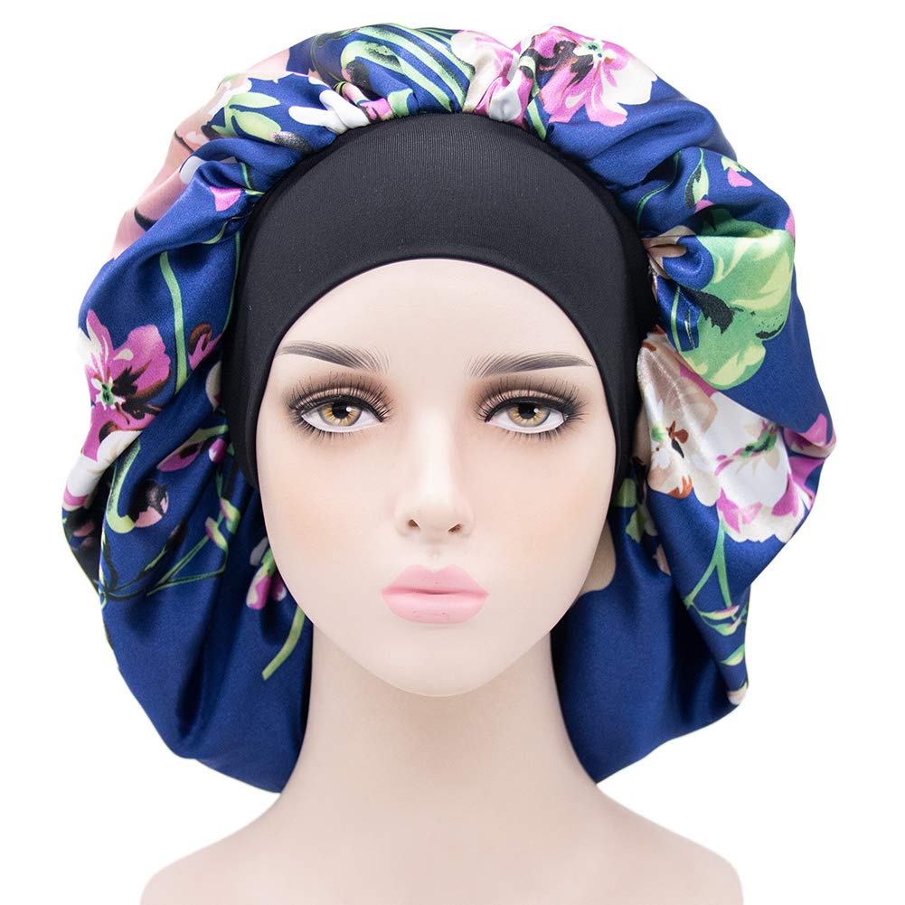 Wide Band Large Satin Bonnet Cap,Bonnets For Women,Silky Bonnet For Curly Hair,Women Hair Wrap For Sleeping,Double Layers (Royal Blue Flowers)