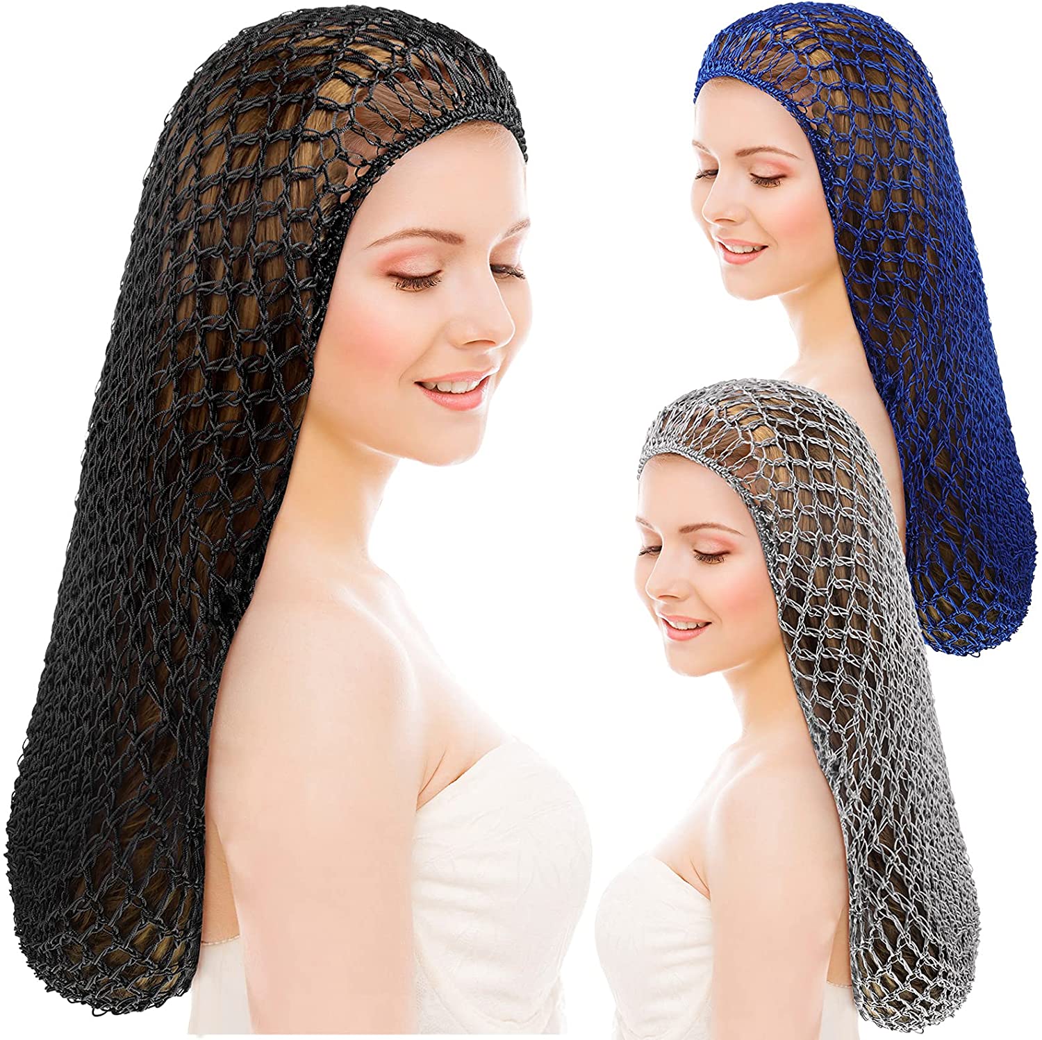 Waydress 3 Pieces Mesh Crochet Hair Net Crocheted Hair Net Cap Soft Rayon Snood Hat 20 Inch Sleeping Cap Hair Accessories For Women (Black, Gray, Sapphire) At Women’S Clothing Store
