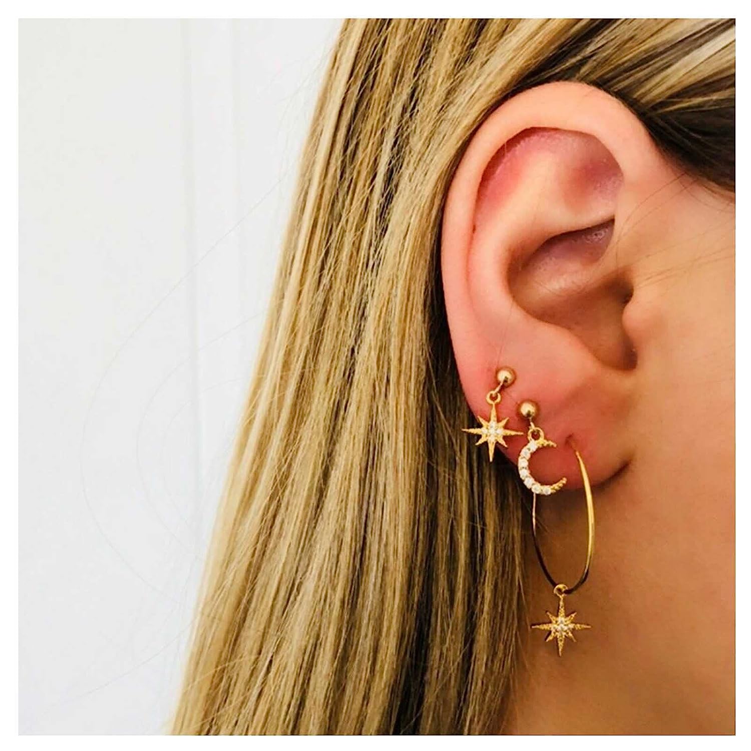 Bohemia Crystal Star Hoop Earrings Dangle Moon Crescent Stud Earrings Gold Huggie Earrings Rhinestone Cz North Star Earrings Set Jewelry for Women and Girls