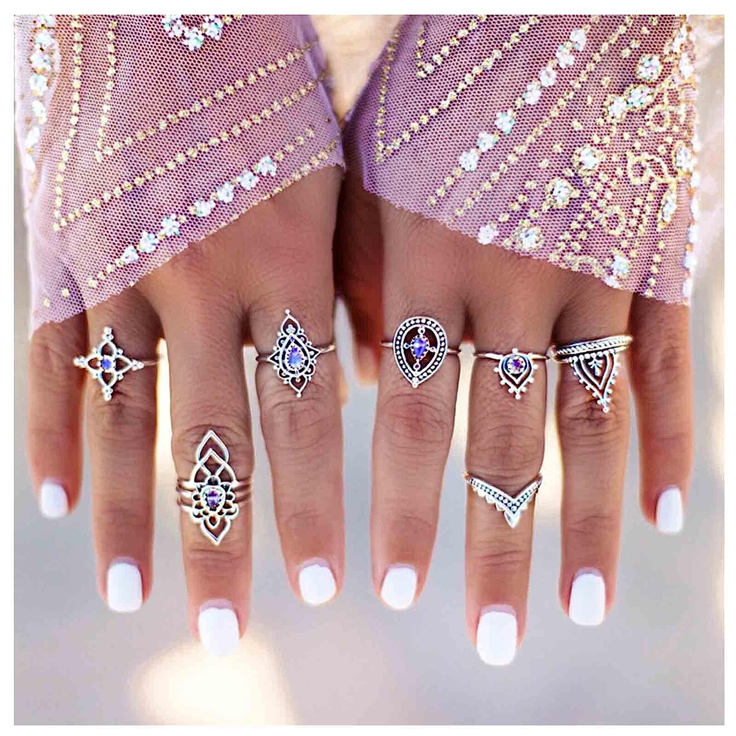 Vintage Purple Crystal Rings Carved Knuckle Mid Rings Teardrop CZ Finger Rings Exaggerate Silver Stackable Rings Set Jewelry for Women and Girls 7 Pcs