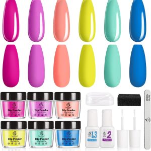 Dip Powder Nail Kit- 6 Colors Bright Summer Pool Party Hot Pink Yellow Green Blue Nail Dipping Powder Set with Base Top Coat Activator Nail File, No LED Lamp Needed