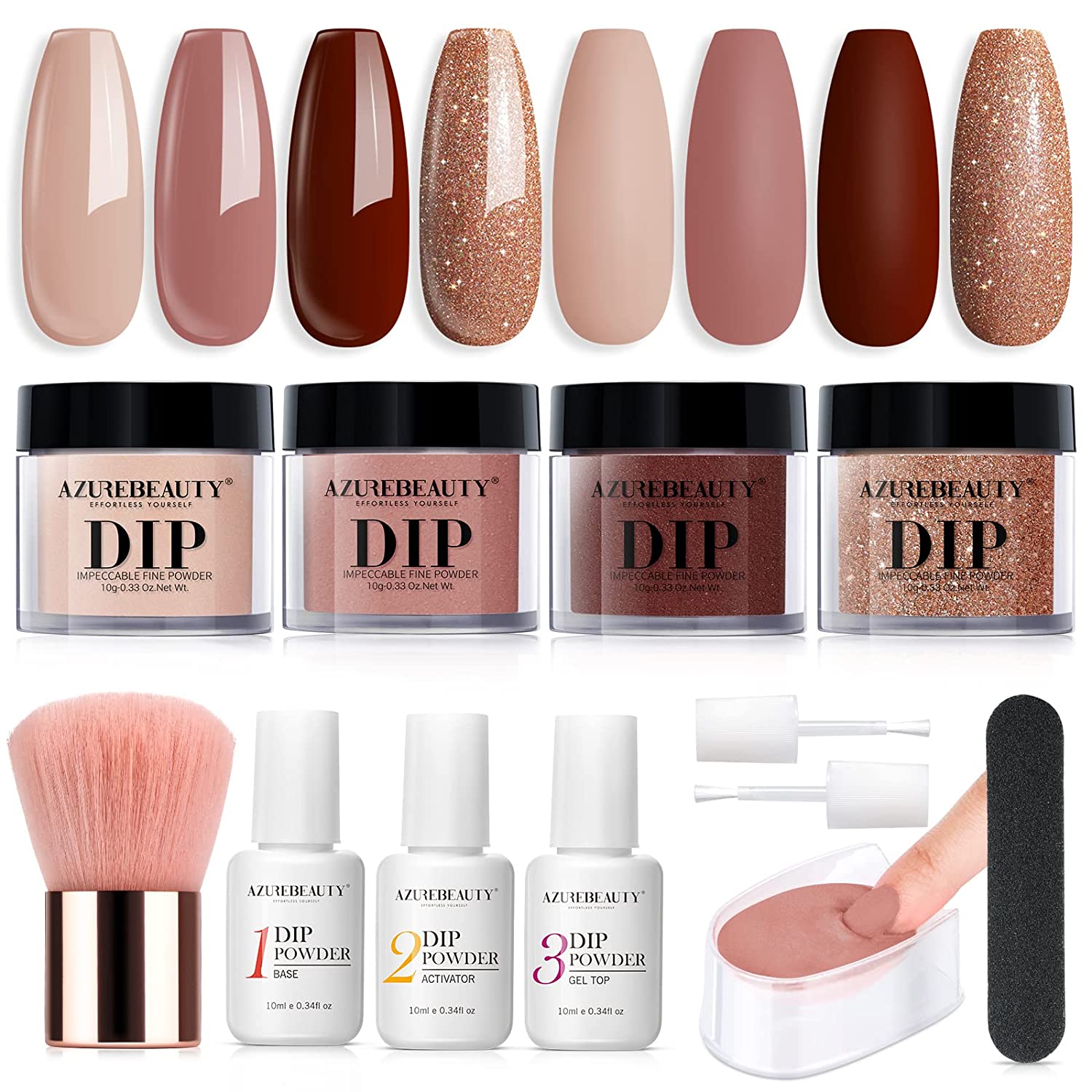 Dip Powder Nail Kit Starter, 4 Colors Skin Nude Brown Glitter, Acrylic Dipping Powder Liquid Set with Base/Top Coat Activator for Daily French Nail Art Manicure DIY Gift 12 Pcs
