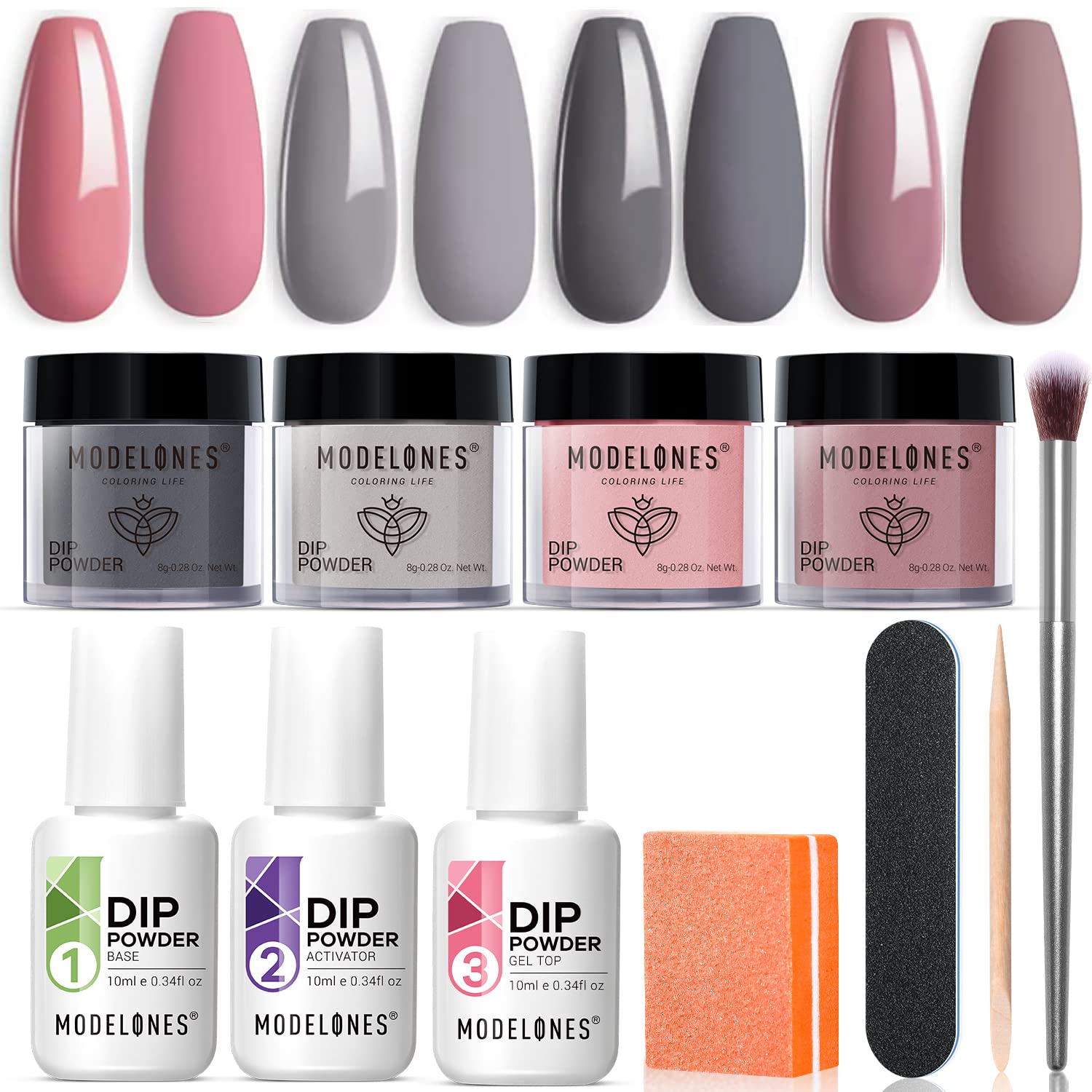 Dip Powder Nail Kit Starter, 4 Colors Gentle Pink Dipping Powder Essential Liquid Set with Base Top Coat Activator for French Nail Art Beginner Manicure DIY Salon All-in-One Beginner Extension Kit Gift