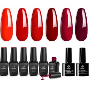 Red Gel Nail Polish Set – 6 Colors Bloody Mary Collection Soak Off LED with 2 Pcs 15ml No Wipe Gel Top Coat and Base Coat Set Nail Art Design Gifts for Women