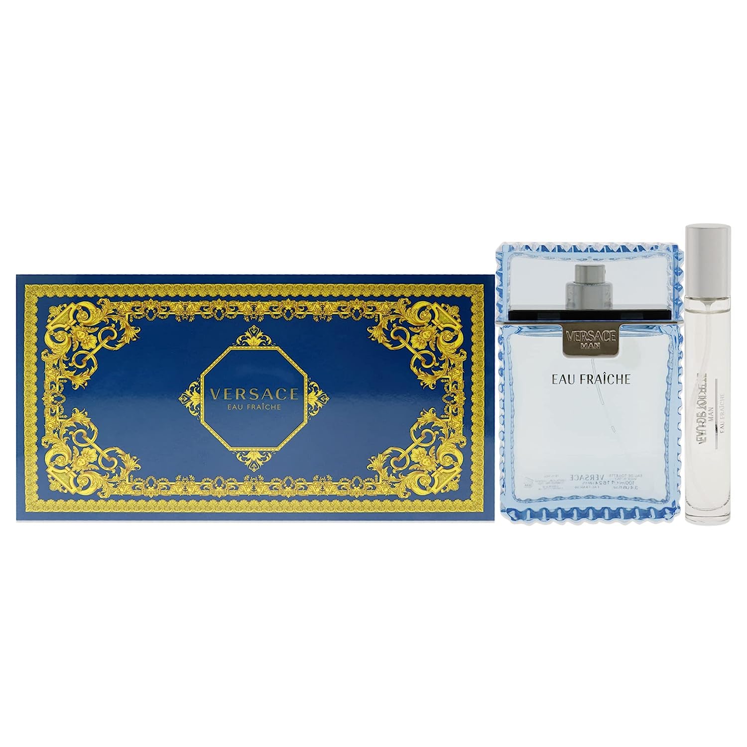 Eau Fraiche for Men 3 Piece Set (3.4 Oz Eau De Toilette Spray + 10ml Travel Spray + Blue Trousse)