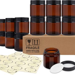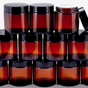 12, Amber, 4 oz, Round Glass Jars, with Inner Liners and black Lids