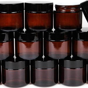 12, Amber, 2 oz, Round Glass Jars, with Inner Liners and black Lids
