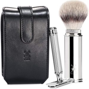 TRAVEL Black Leather Case Silvertip Fiber Safety Razor Travel Set