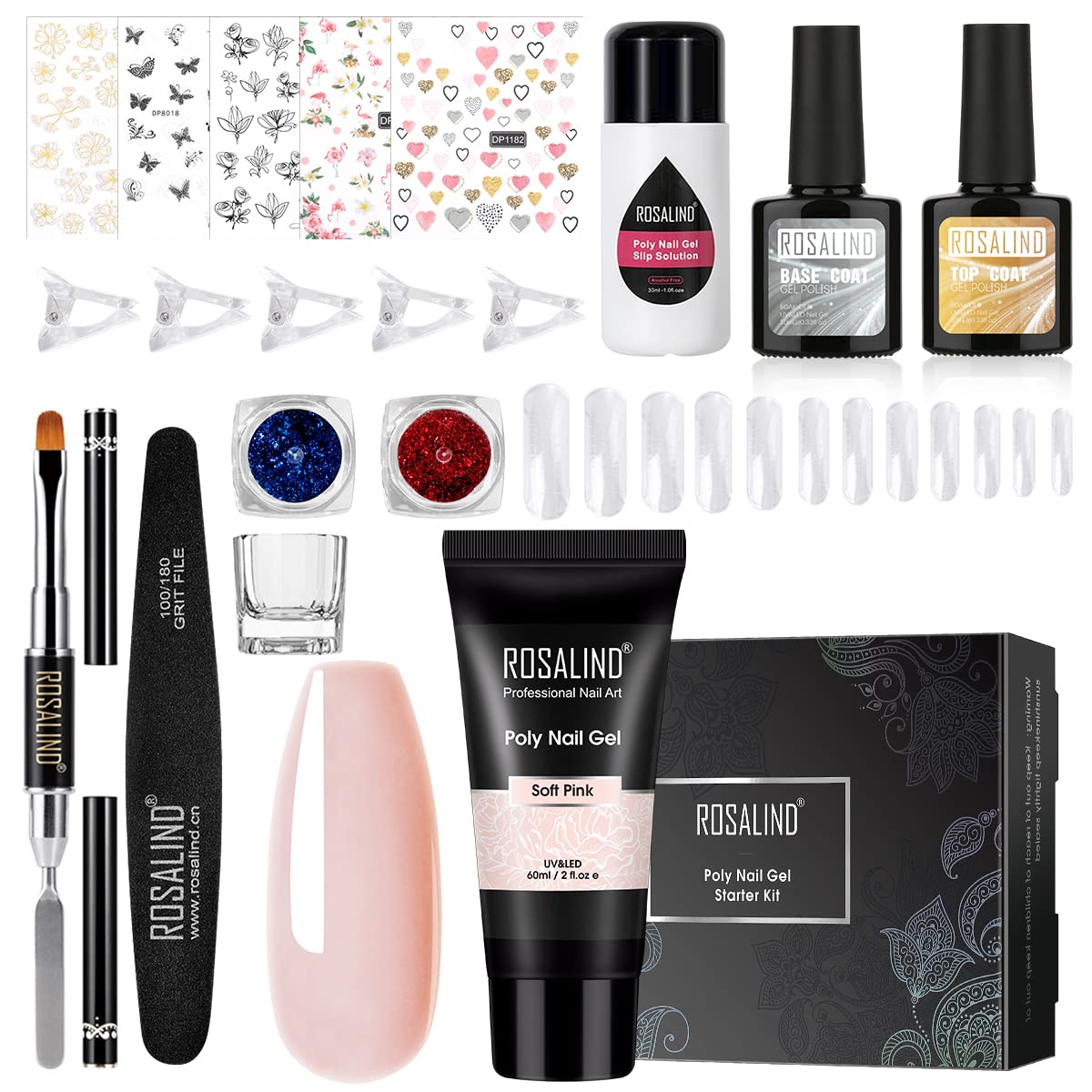 Nail Gel Kit, ROSALND 60ml Soft Pink Poly Nail Extension Gel Pink Poly Nail Enhancement Nail Thickening with Base Top Coat Slip Solution Nail Clips Glitter Nail Manicure All In One Kit
