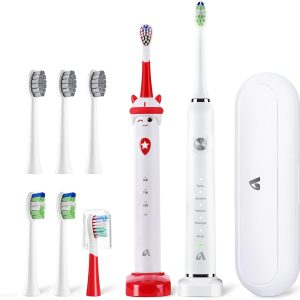 Red Electric Toothbrush for Kids with White Sonic Electric Toothbrush for Adult
