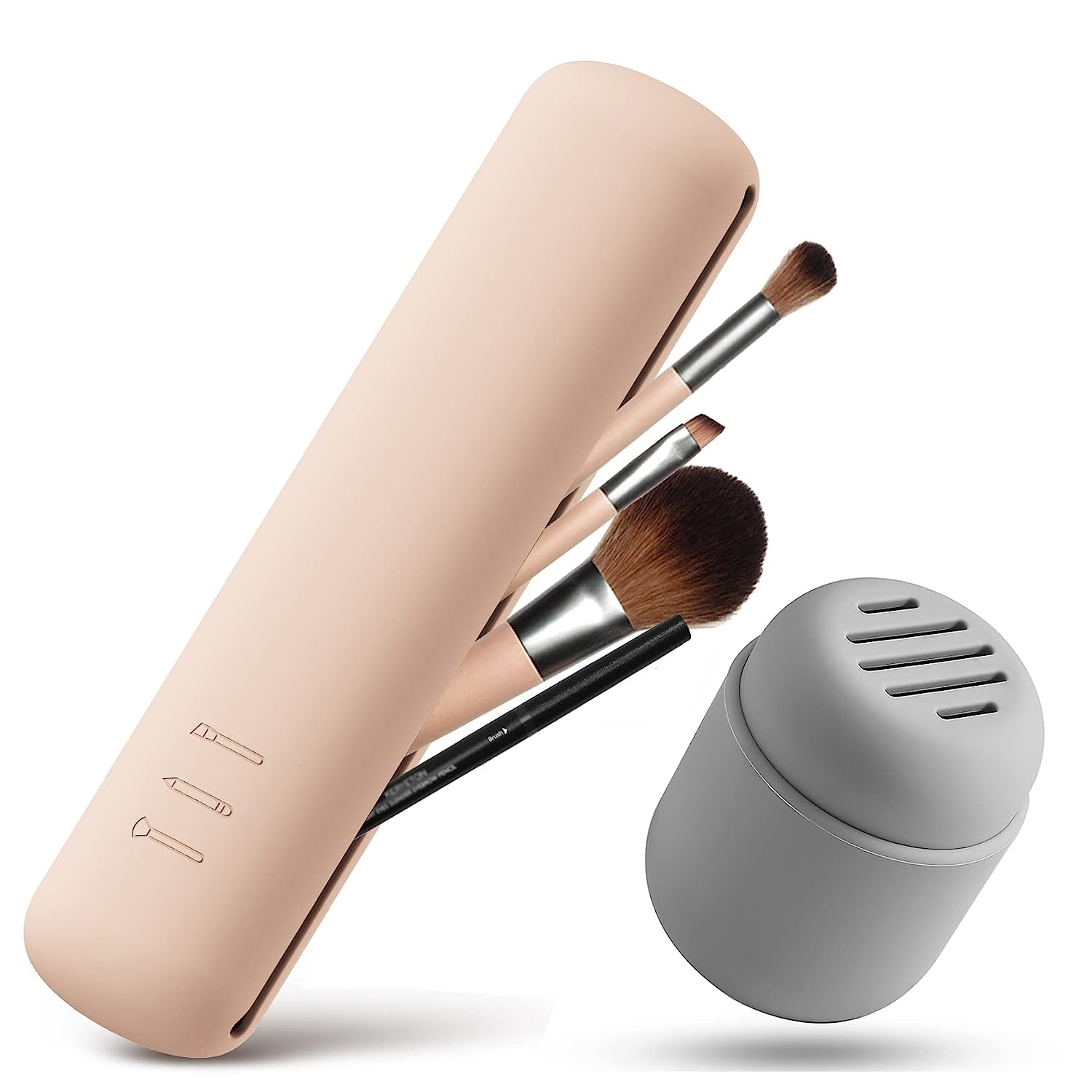 Silicone Makeup Brush Holder(Khaki) and Makeup Sponge Holder Travel Case(Grey)