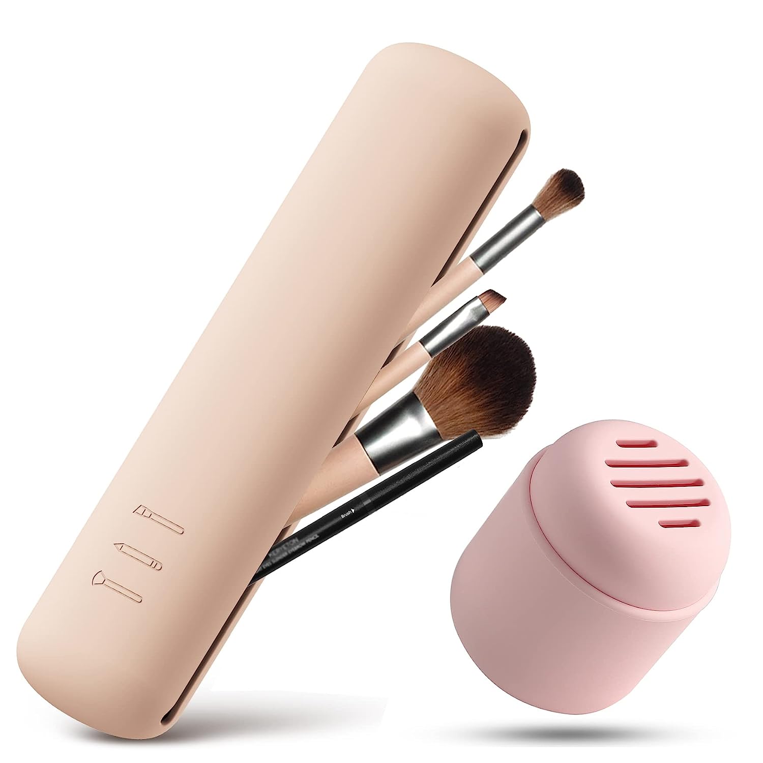 Silicone Makeup Brush Holder(Khaki) and Makeup Sponge Holder Travel Case(Pink)