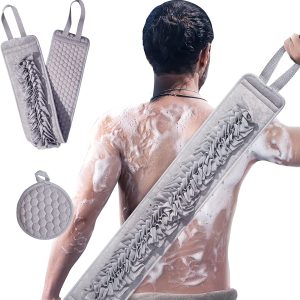 Pack 40.5 Inch Loofah Back Scrubber for Shower Set with Sponge Pad for Women and Men, Gray & Beige