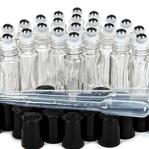 24, Clear, 10 ml Glass Roll-on Bottles with Stainless Steel Roller Balls. 3-3 ml Droppers included