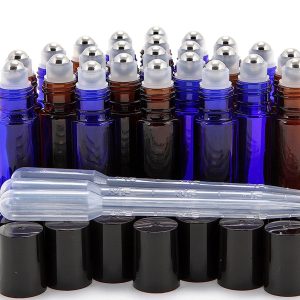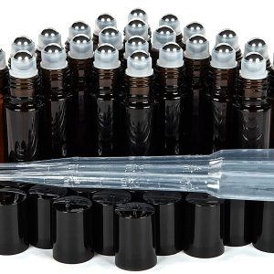 24, Amber, 10 ml Glass Roll-on Bottles with Stainless Steel Roller Balls. 3-3 ml Droppers included