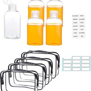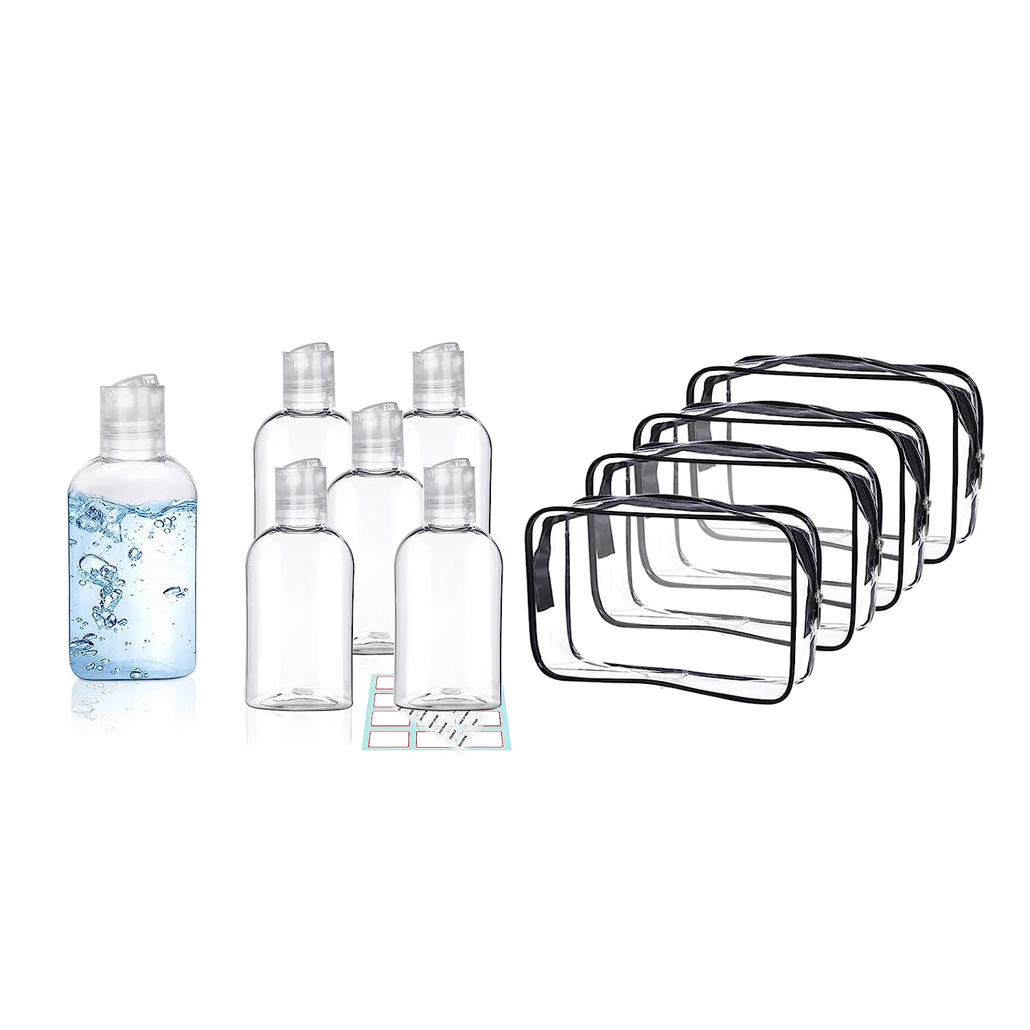 Clear Plastic Empty Squeeze Bottles with Disc Top Caps & Clear TSA Approved Toiletry Bag 4 Pack
