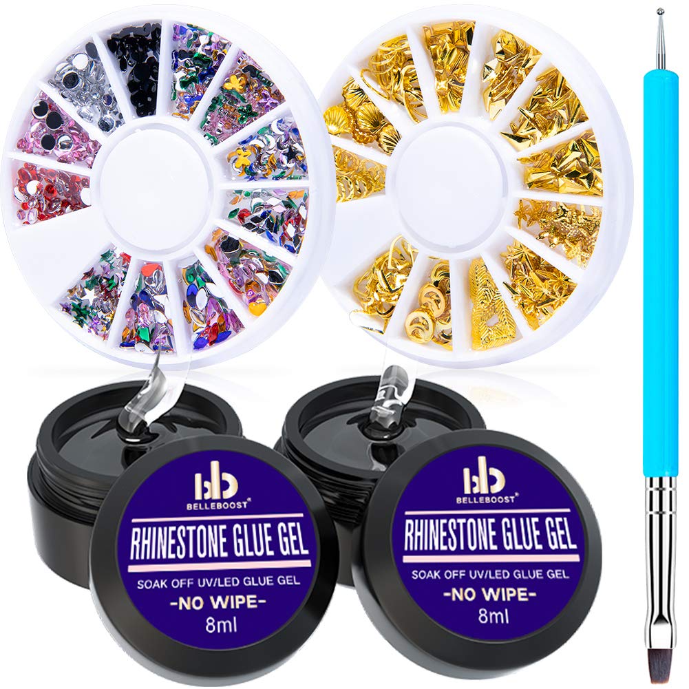 Art 8ml×2 NO WIPE Rhinestone Glue Gel Adhesive Resin Gem Bead Stone Jewelry Diamond Gel Nail Polish Clear Decoration With Nail Rhinestones(Acrylic+Rivet)&Dual-Use Pen Tool (LED Light Cure Needed)