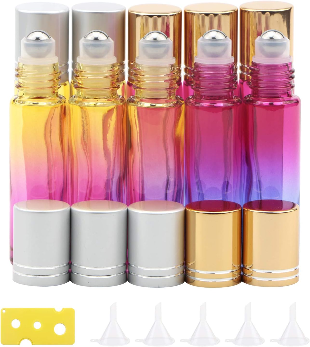 * Package include: 5 x 10ml Rose-Blue Gradient Glass Roller-on Bottles 5 x 10ml Yellow-Rose Gradient Glass Roller-on Bottles 1 x Bottle Opener Tool 5 x Funnels