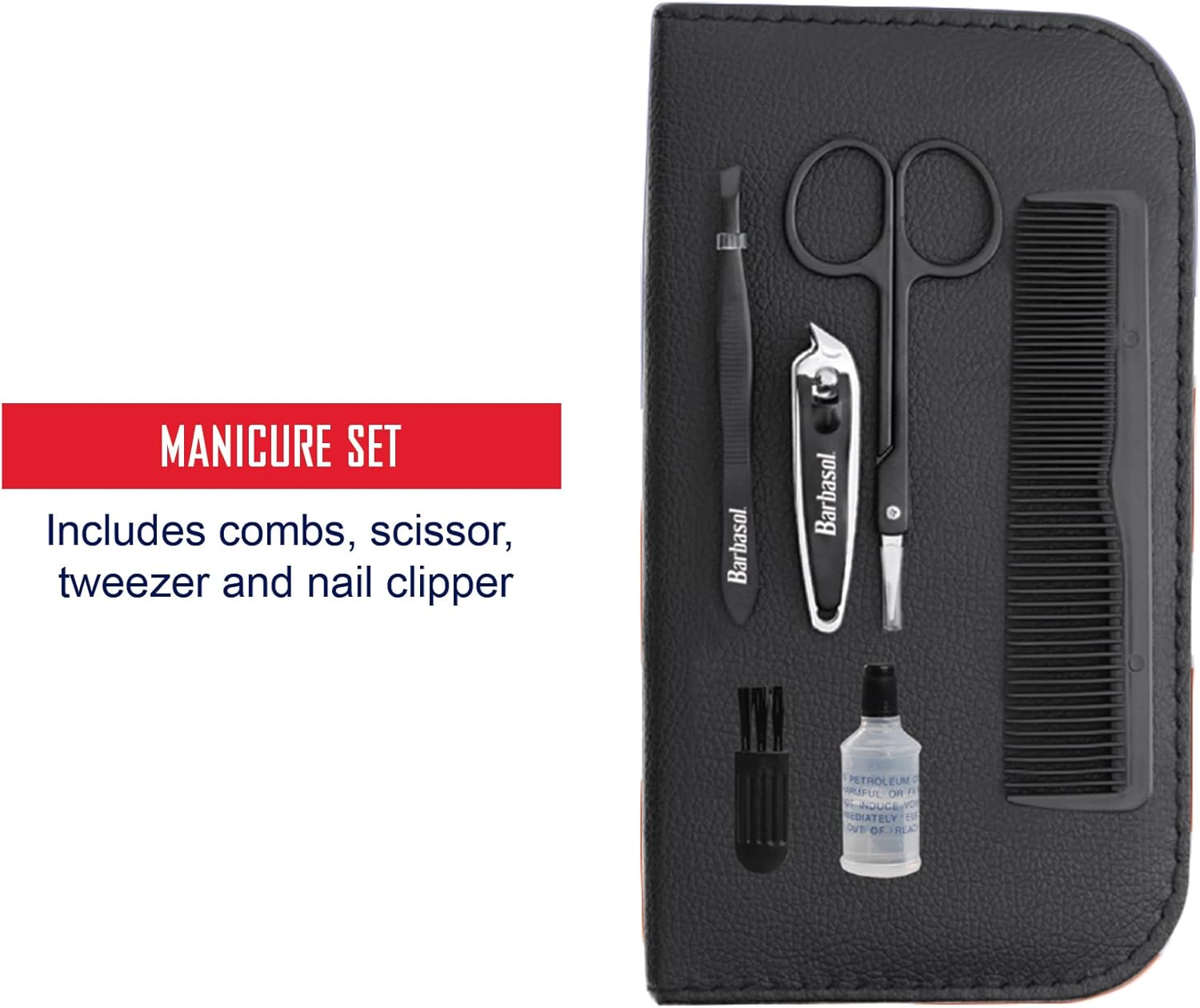 The manicure set comes with a comb, scissors, tweezers, and nail clipper to make your appearance the best it can be.