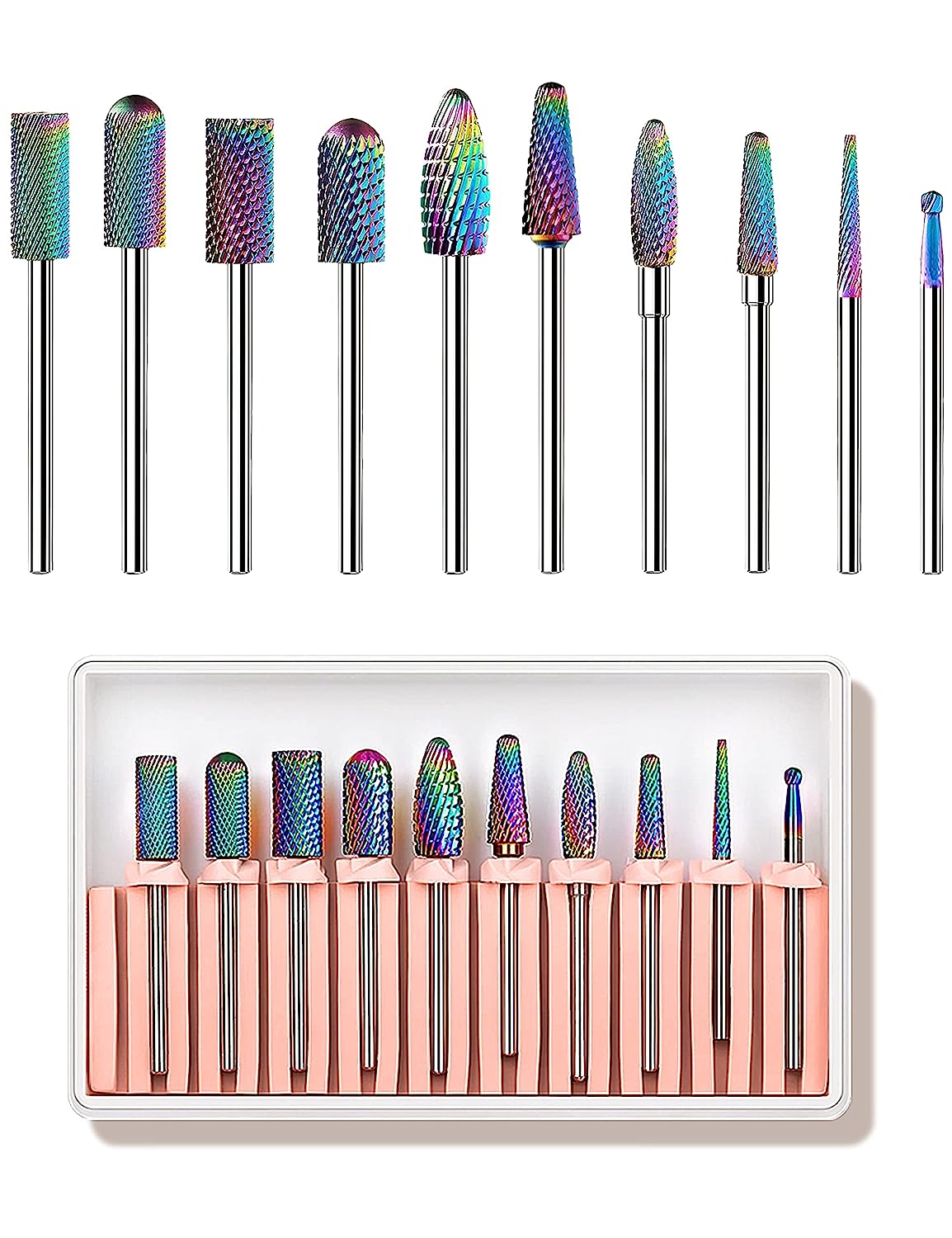 Nail Drill Bits: 10pcs tungsten carbide material different functions nail drill kit, which meets all needs of manicure pedicure. The nail bits fit 3/32 inch professional electric nail drills on the market.