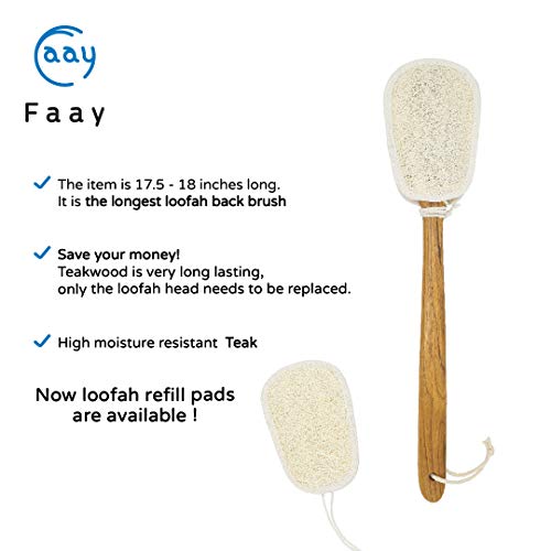 100% LOOFAH SCRUBBER WITH ESPECIALLY LONG TEAK HANDLE: Our 2 side egyptian loofah pad, the best loofah type for skin exfoliation, will gently remove your dead skin cells and provide muscle relaxation to enhance your shower routine. The durable moisture-resistant teak handle is made 17” long to make sure it reaches your entire back. There are also refill loofah pads sold separately; you don’t have to buy the handle again. Use it on a daily basis for your softer and younger skin.