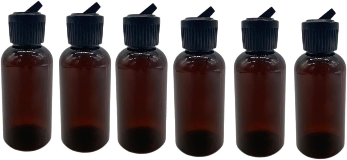Specifications: Material: Plastic Quantity: 6 pack/set Shape: Boston Round Packaging: 6 pieces X 2 oz Amber plastic bottle with Black Spout Cap.