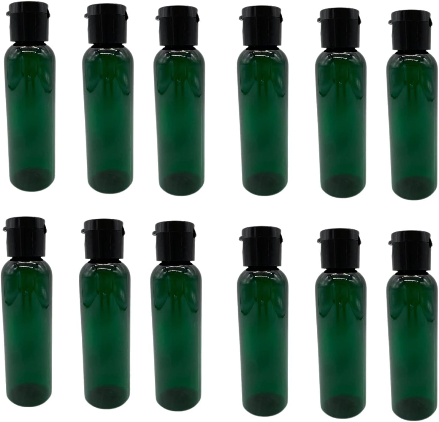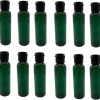 Specifications: Material: Plastic Quantity: 12 pack/set Shape: Cosmo Round Packaging: 12 pieces X 2 oz green plastic bottle with black flip top snap cap