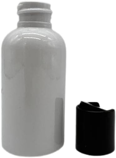 Specifications: Material: Plastic Quantity: 12 pack/set Shape: Boston Round Packaging: 12 pieces X 2 oz white plastic bottle with black press down disc caps.