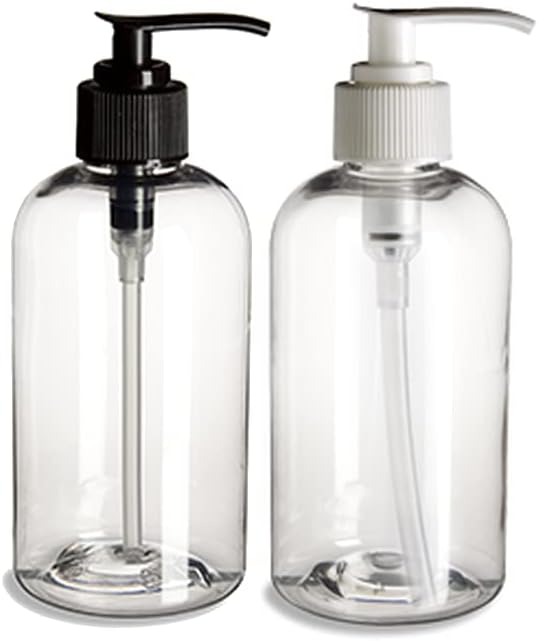 Specifications: Material: Plastic Quantity: 2 pack Shape: Boston Round Packaging: 2 X 8 oz Clear plastic bottle with pump.